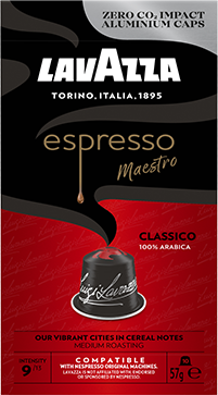 The Lavazza Espresso Maestro Classico provides a balanced taste of roasted grain and delicate biscuits on the finish. The perfect choice for true espresso lovers.